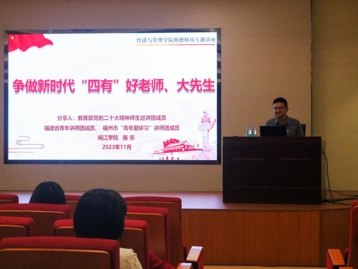 為深入貫徹落實(shí)黨的二十大精神,引導(dǎo)廣大教職工堅(jiān)定理想信念、陶冶道德情操、涵養(yǎng)扎實(shí)學(xué)識(shí)、勤修仁愛(ài)之心,進(jìn)一步發(fā)揮教師的積極性、主動(dòng)性、創(chuàng)造性,全面落實(shí)立德樹人根本任務(wù),2023年11月8日,經(jīng)濟(jì)與管理學(xué)院開展2023年師德師風(fēng)專題講座,特邀全國(guó)模范教師陳東作《爭(zhēng)做新時(shí)代“四有”好老師、大先生》專題報(bào)告。