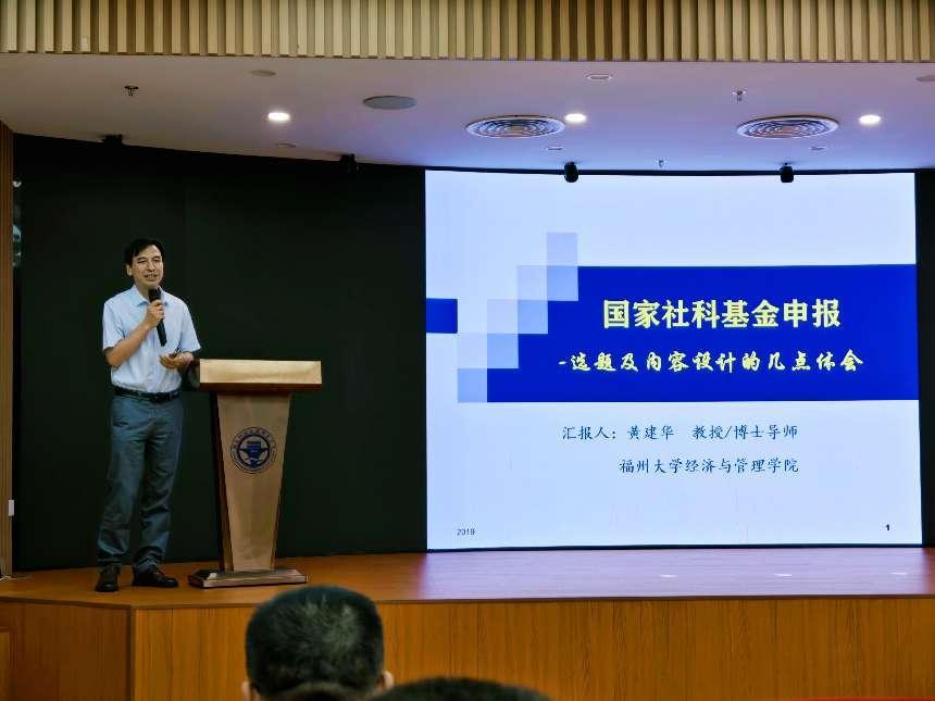 活動(dòng)邀請(qǐng)了福州大學(xué)經(jīng)濟(jì)與管理學(xué)院黃建華教授作主題講座。黃建華教授是福州大學(xué)物流研究院副院長(zhǎng)、福建省高層次人才、博士生導(dǎo)師。國(guó)家社科基金通訊評(píng)審專家,福建省、湖南省、河北省、江西省等省份的自然科學(xué)基金項(xiàng)目函評(píng)專家;兼任教育部學(xué)位中心博士論文、碩士論文評(píng)審專家,福建省政府投資項(xiàng)目評(píng)審專家、福州市發(fā)改委項(xiàng)目評(píng)審專家;福建省應(yīng)急廳應(yīng)急管理專家。講座以“國(guó)家社科基金申報(bào)”為題,為參會(huì)的博士教師們作了精彩報(bào)告。黃教授圍繞國(guó)家社科基金項(xiàng)目的指南走向、選題原則、論證活頁(yè)和申報(bào)書撰寫技術(shù)細(xì)節(jié)等視角展開分享。他強(qiáng)調(diào)雖然國(guó)社科從課題指南發(fā)布到提交時(shí)間比較短,但中標(biāo)的課題一定是一個(gè)長(zhǎng)期思考與積累的結(jié)果。他鼓勵(lì)與會(huì)教師,將個(gè)人學(xué)術(shù)研究興趣與國(guó)家和社會(huì)發(fā)展相融合,積極申報(bào),反復(fù)打磨,爭(zhēng)取盡早取得突破。