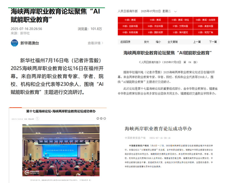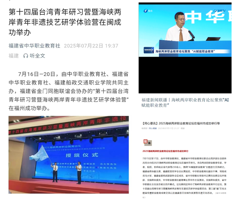 7月15日-17日,2025海峽兩岸職業(yè)教育論壇在福建省福州市成功舉行。此次論壇以“AI賦能職業(yè)教育”為主題,由中華職業(yè)教育社、福建省中華職業(yè)教育社聯(lián)合臺(tái)灣多家社會(huì)團(tuán)體共同主辦,福建船政交通職業(yè)學(xué)院承辦,《教育與職業(yè)》雜志社協(xié)辦。論壇期間,第十四屆臺(tái)灣青年研習(xí)營(yíng)暨海峽兩岸青年非遺技藝研學(xué)體驗(yàn)營(yíng)同步舉辦。本次論壇獲得了新華社、人民網(wǎng)、中國(guó)臺(tái)灣網(wǎng)、中國(guó)教育報(bào)、經(jīng)濟(jì)日?qǐng)?bào)、中國(guó)新聞網(wǎng)、中華職業(yè)教育社、福建省中華職業(yè)教育社、福建電視臺(tái)、同心福建等十多家主流媒體報(bào)道。