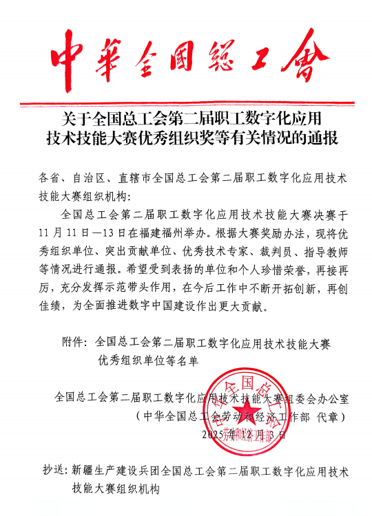 近日,中華全國總工會發(fā)布通報,表揚在全國總工會第二屆職工數字化應用技術技能大賽中表現突出的單位和個人,我院榮獲“突出貢獻單位”榮譽。