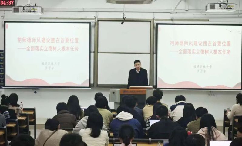 師德師風是教師隊伍建設(shè)的靈魂,福建農(nóng)林大學馬克思主義學院羅賢宇教授在《把師德師風建設(shè)擺在首要位置——全面落實立德樹人根本任務(wù)》專題講座中,報告深入解讀了新時代教師職業(yè)行為準則,結(jié)合典型案例,強調(diào)了筑牢師德底線、關(guān)愛學生成長、恪守學術(shù)道德的重要性。講座引導新教師們深刻思考“為誰培養(yǎng)人、培養(yǎng)什么人、怎樣培養(yǎng)人”這一根本問題,激勵大家爭做“四有”好老師,將立德樹人根本任務(wù)內(nèi)化于心、外化于行。