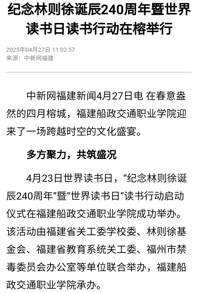 4月23日下午,在福建船政交通職業(yè)學(xué)院舉辦“紀(jì)念林則徐誕辰240周年暨世界讀書日讀書行動啟動儀式活動。