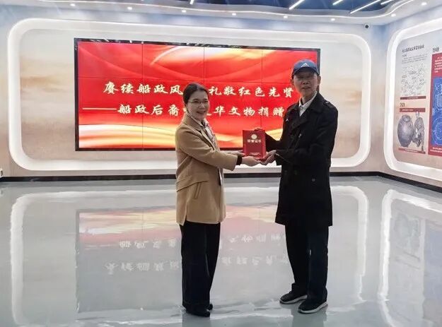 講座結(jié)束后,葉延華向?qū)W院無償捐贈6件珍貴的葉可鈺遺物,包括海軍制服配件、黨費證及工作筆記等,陳艷紅代表學院接受捐贈,并向葉延華先生致以由衷敬意與誠摯感謝。隨后,陳艷紅為葉延華頒授捐贈證書,雙方共同為展覽剪彩,正式拉開“紅色船政人”系列展覽的序幕。