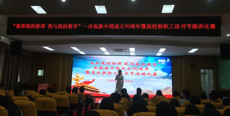 分會場設(shè)在行政樓6樓學(xué)術(shù)報告廳,舉行了“我和我的祖國 我與我的教學(xué)” 慶祝新中國成立70周年暨高校教職工讀書節(jié)演講比賽。本次演講比賽全省17所高校進(jìn)入決賽,全場比賽以從踐行社會主義核心價值觀和中華民族文化自信為切入點(diǎn),結(jié)合日常學(xué)科教育教學(xué)方法,準(zhǔn)確流暢的語言表達(dá)、自然樸實的體姿,展示教師們良好的精神風(fēng)貌。