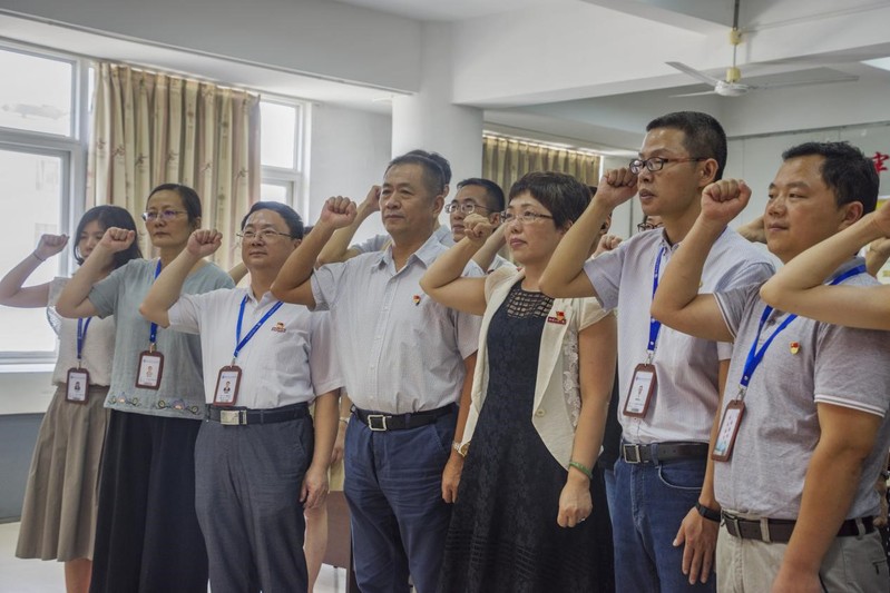 1.全體黨員舉行了重溫入黨誓詞的儀式。面對鮮紅的黨旗,全體黨員一起高舉右手,再次莊嚴宣誓?!拔抑驹讣尤胫袊伯a(chǎn)黨……隨時準備為黨和人民犧牲一切,永不叛黨?!比w黨員聲音鏗鏘、句句千鈞,神情莊重地許下對黨和人民的承諾。