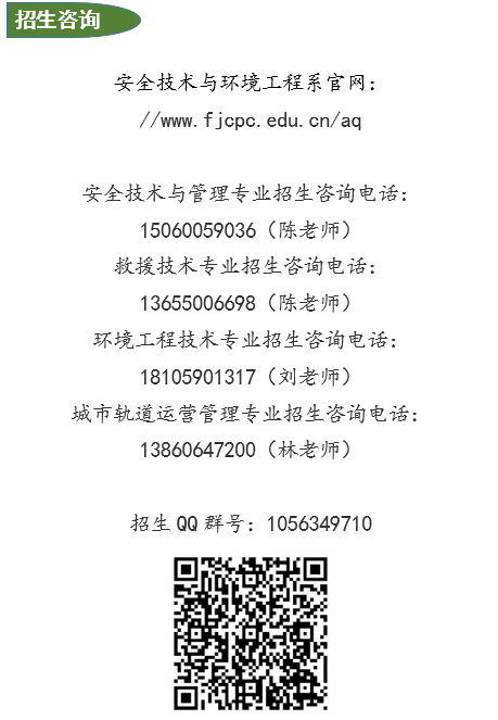 安全技術(shù)與環(huán)境工程系2020年擬開設(shè)安全技術(shù)與管理、環(huán)境工程技術(shù)、城市軌道交通運(yùn)營與管理、救援技術(shù)四個(gè)專業(yè),其中安全技術(shù)與管理、環(huán)境工程技術(shù)是“中國特色高水平高職學(xué)校”重點(diǎn)建設(shè)專業(yè)群核心專業(yè)。