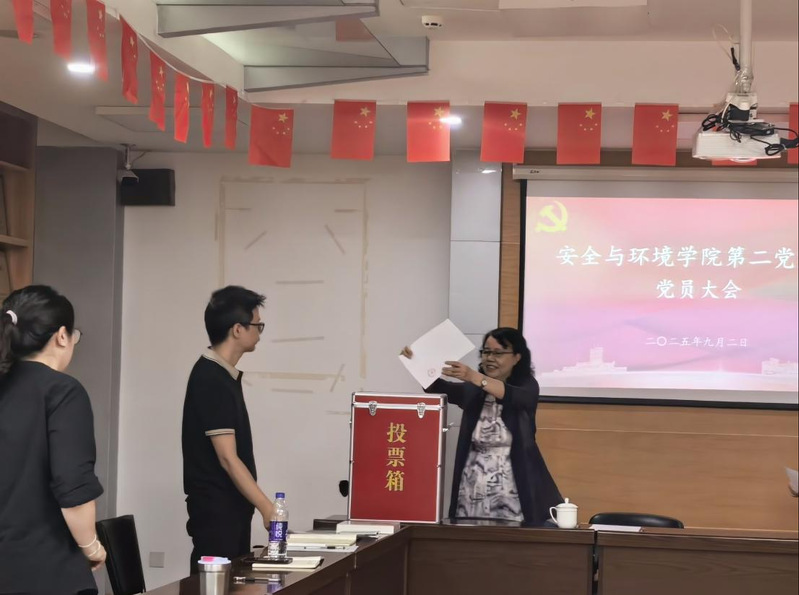 圖為黨委副書記、院長陳群以普通黨員身份參加安全與環(huán)境學院第二黨支部黨員大會并投下神圣一票