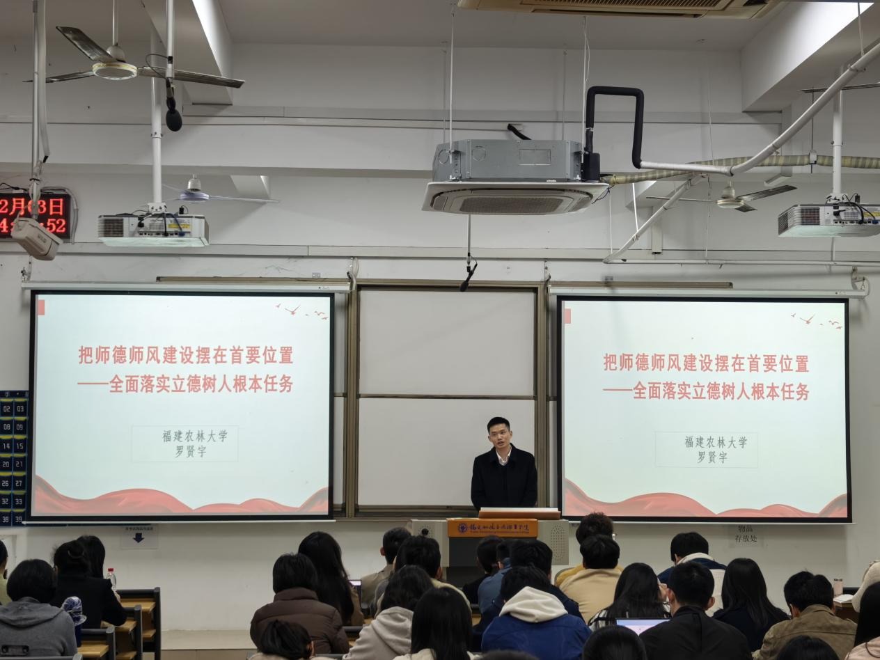 為強化教師隊伍的育人責(zé)任與職業(yè)素養(yǎng),2025年12月3日,校教師工作部(處)邀請福建農(nóng)林大學(xué)羅賢宇副教授作題為“把師德師風(fēng)建設(shè)擺在首要位置——全面落實立德樹人根本任務(wù)”的專題講座。教師工作部徐水群副部(處)長主持會議,安全與環(huán)境學(xué)院全體教師聽取講座。