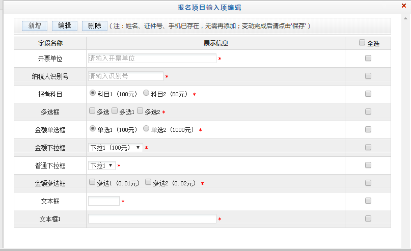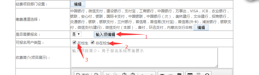(1)此位置可以自定義報名選項,可約束學生在報名時是否是必填或選填;