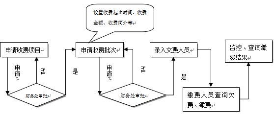 收費部門收費流程:申請收費項目——>等待財務處審批——>使用已審批項目申請收費批次(制定具體交費時間、交費標準等)——>等待財務處審批——>向已審批的收費批次中導入收費人員信息——>監(jiān)控收費狀況——>查詢交費結(jié)果——>交費結(jié)束。如下圖:
