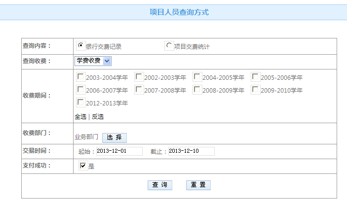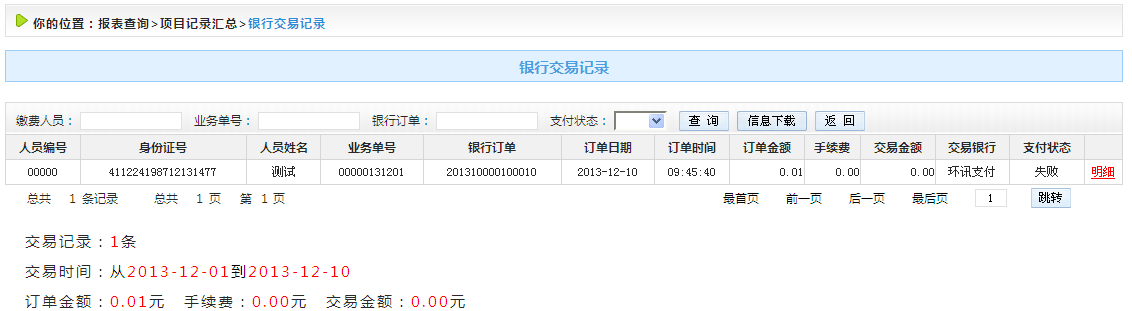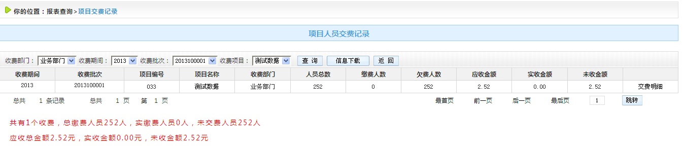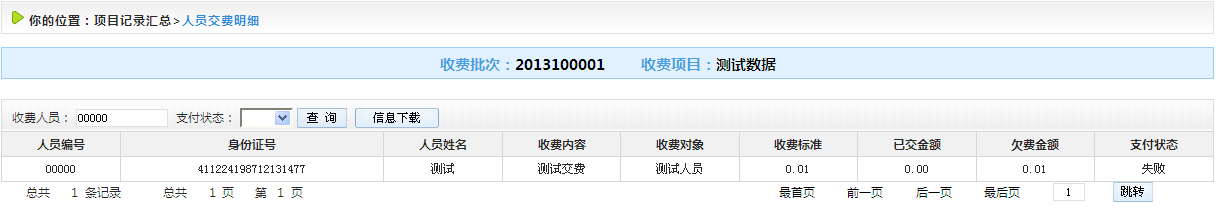 選擇收費項目,輸入人員姓名、編號、身份證號以及支付狀態(tài),點擊按鈕查詢具體的繳費人員信息。