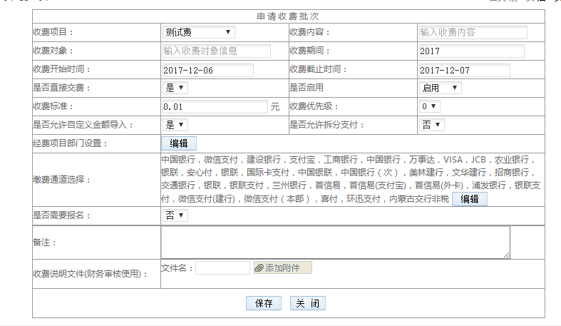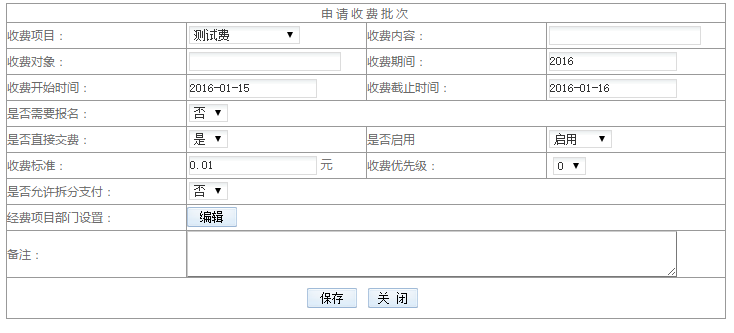 3)收費開始、截止時間:定義收費起止時間,學生只能在該期間內(nèi)繳費。