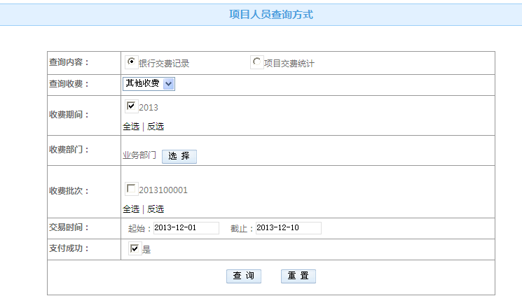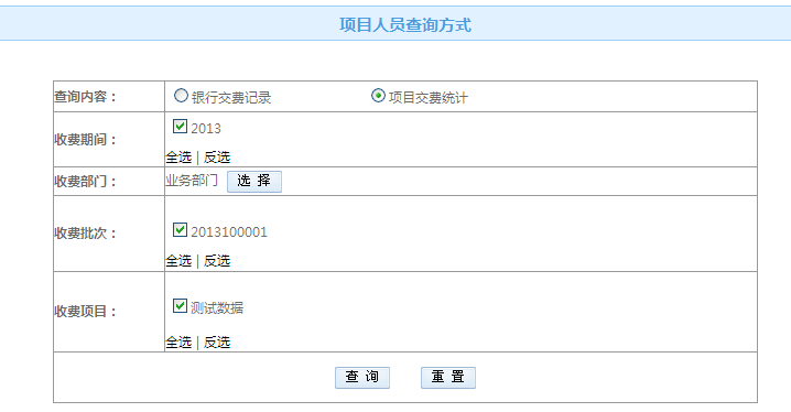 項目記錄匯總包括項目銀行繳費記錄匯總和項目交費統(tǒng)計兩部分。點擊菜單欄報表查詢——>項目記錄匯總。