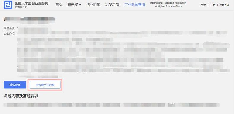 第四步:點擊“與命題企業(yè)對接”,跳轉(zhuǎn)至【產(chǎn)業(yè)命題賽道命題企業(yè)對接、企業(yè)命題申報平臺】,注冊登錄后與命題企業(yè)對接咨詢,進一步了解命題具體解答要求、獲取企業(yè)支持等(詳見附件3)。 注:此平臺賬號非大創(chuàng)網(wǎng)賬號,須重新注冊。