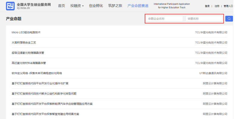 第三步:訪問【全國大學生創(chuàng)業(yè)服務網(wǎng)】(網(wǎng)址:https://cy.ncss.cn/)—產(chǎn)業(yè)命題賽道—參賽報名—產(chǎn)業(yè)命題賽道版塊,按照命題企業(yè)名稱及命題名稱搜索命題,瀏覽命題內(nèi)容及答題要求。