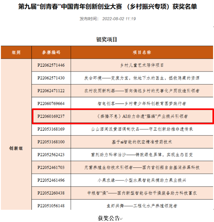 我院參賽的“《奔藤不息》AI助力非遺‘藤編’產(chǎn)業(yè)振興引領者”項目,經(jīng)過激烈角逐,獲得創(chuàng)新組國賽銀獎。
