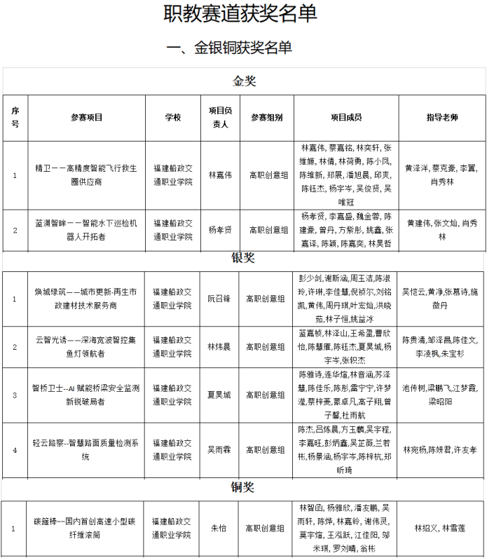 近日,根據(jù)“福建省教育廳關(guān)于公布福建省大學(xué)生創(chuàng)新大賽(2025)獲獎(jiǎng)名單的通知(閩教高〔2025〕20號(hào))”文件,我院在本屆大賽中榮獲2金6銀3銅的成績(jī)。其中,藍(lán)淵智眸——智能水下巡檢機(jī)器人開(kāi)拓者和精衛(wèi)——高精度智能飛行救生圈供應(yīng)商兩個(gè)項(xiàng)目獲得福建省大學(xué)生創(chuàng)新大賽(2025)(職教賽道)金獎(jiǎng);砼筑綠夢(mèng)——建筑垃圾多源骨料集約化智配平臺(tái)構(gòu)建與產(chǎn)業(yè)化應(yīng)用項(xiàng)目獲得產(chǎn)業(yè)命題賽道銀獎(jiǎng);石厝衛(wèi)士——海岸石厝民居文化守護(hù)者項(xiàng)目獲得高教主賽道銀獎(jiǎng)。