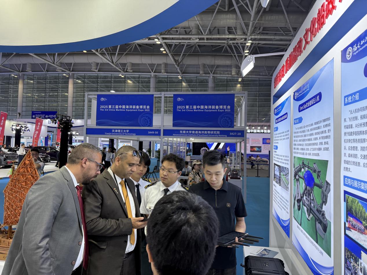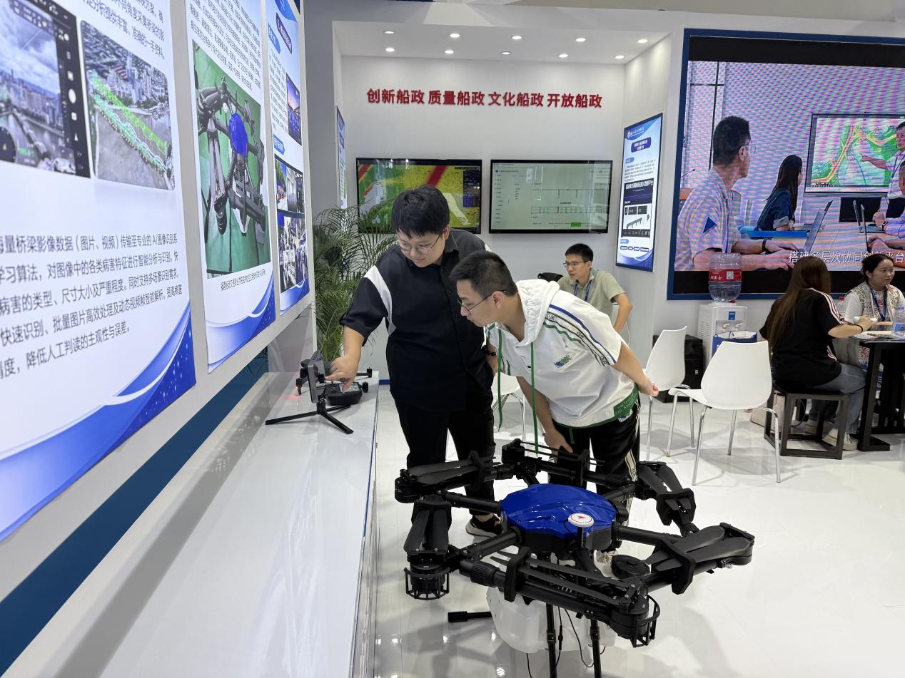 我院受邀參展并在主賓館設(shè)立展區(qū),重點(diǎn)展示了一系列兼具技術(shù)實(shí)力與應(yīng)用價值的成果:包括傳承船政文化的趕繒船結(jié)構(gòu)復(fù)原模型,聚焦智能裝備領(lǐng)域的 AIS 交通流分析系統(tǒng)、Ener16p 農(nóng)業(yè)植保無人機(jī)、無人機(jī)協(xié)同指揮系統(tǒng)、橋梁無人機(jī)巡檢及 AI 病害識別系統(tǒng),深耕大數(shù)據(jù)應(yīng)用的福建省交通基礎(chǔ)設(shè)施大數(shù)據(jù)平臺,以及榮獲國家級教學(xué)成果獎的《新船政學(xué)堂:燈塔型航海人才雙適任育訓(xùn)范式創(chuàng)新實(shí)踐》項目。豐富多元的展品吸引了眾多參會觀眾駐足咨詢、互動體驗并拍照記錄。展區(qū)內(nèi)的茶藝展示區(qū)更是成為交流熱點(diǎn),專家學(xué)者們在品茗暢談間,圍繞航海類專業(yè)人才培養(yǎng)、船政文化傳承創(chuàng)新、區(qū)域海洋裝備產(chǎn)業(yè)升級、國際人才聯(lián)合培育等關(guān)鍵議題展開深度研討。展覽期間,我院的辦學(xué)成果與特色展品獲得多家官方媒體及自媒體的關(guān)注與宣傳報道,有效提升了學(xué)院的行業(yè)影響力與社會知名度。