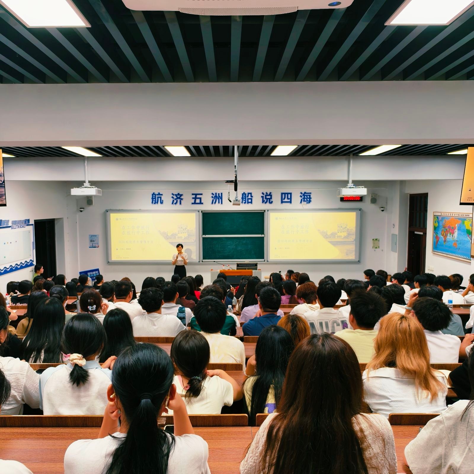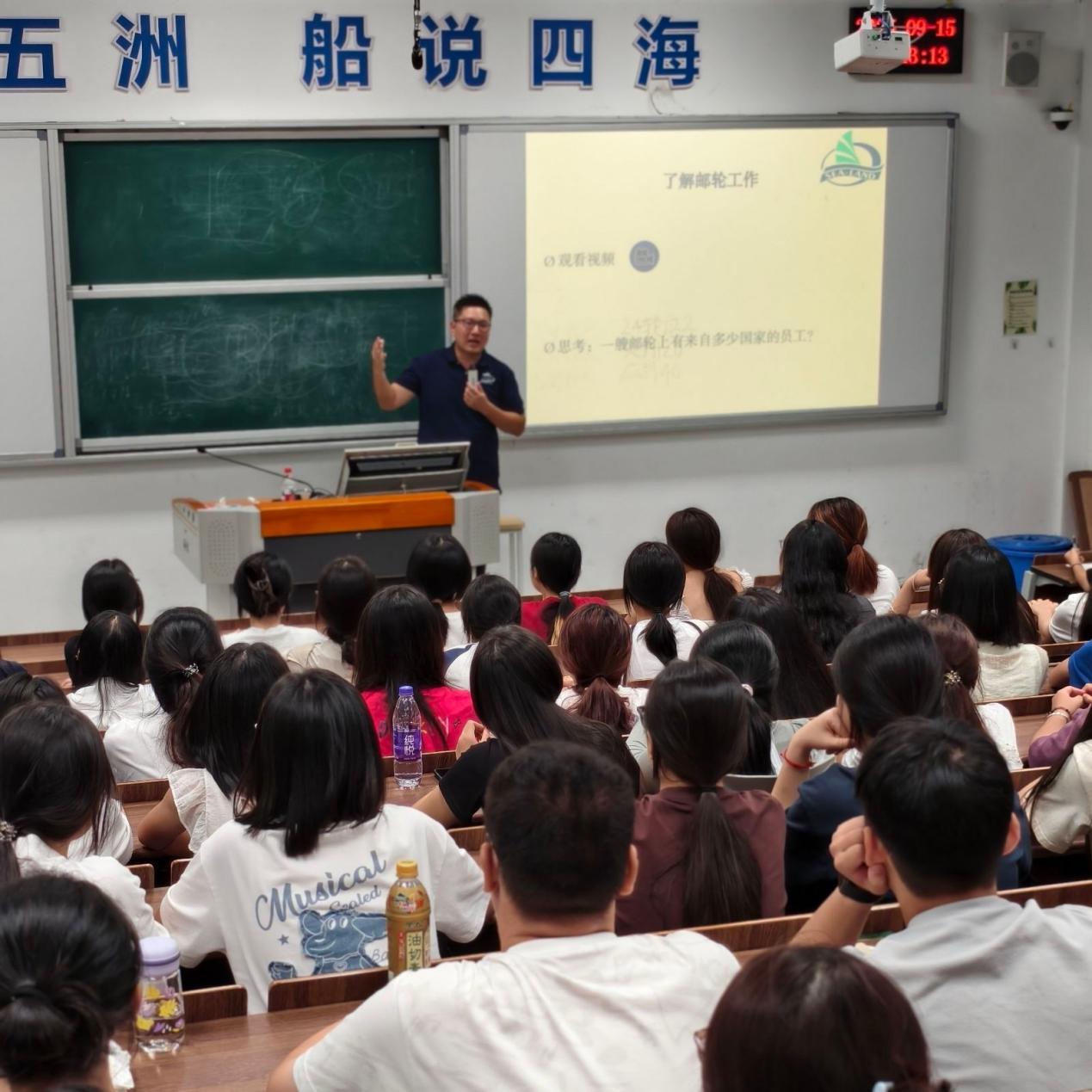 隨后,廈門海陸海事服務(wù)有限公司李樂天經(jīng)理結(jié)合多年行業(yè)經(jīng)驗(yàn),深入剖析了國(guó)際郵輪產(chǎn)業(yè)的發(fā)展趨勢(shì)與人才需求。他指出,隨著全球郵輪旅游市場(chǎng)的復(fù)蘇與擴(kuò)張,具備國(guó)際化視野、跨文化溝通能力和扎實(shí)服務(wù)技能的乘務(wù)人才備受青睞。李經(jīng)理以本校2015級(jí)優(yōu)秀畢業(yè)生陳麗娜(現(xiàn)任職于歌詩(shī)達(dá)郵輪)為例,鼓勵(lì)新生珍惜在校時(shí)光,夯實(shí)語(yǔ)言、禮儀與應(yīng)急處理能力,積極考取國(guó)際認(rèn)證證書,為未來(lái)登上世界知名郵輪公司奠定堅(jiān)實(shí)基礎(chǔ)。