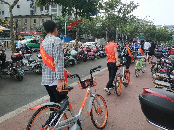 早上7點(diǎn)30分志愿者后志愿者們來到福建省福州市倉山區(qū)首山路,將路邊隨意???、雜亂擺放的共享單車擺放整齊,同時(shí)倡導(dǎo)居民做文明的騎行者、文明的停放者、文明的宣傳者,自覺維護(hù)、愛護(hù)共享單車。本次活動(dòng)主要分為兩個(gè)部分:一是整理維護(hù)共享單車,深入到倉山區(qū)各個(gè)街道,將隨意停放在城市主干道的共享單車統(tǒng)一搬到自行車指定停放點(diǎn),同時(shí)把已遭損壞的共享單車單獨(dú)擺放并整理維護(hù);二是宣傳文明騎車?yán)砟?,針對不少市民和游客存在的在機(jī)動(dòng)車道行駛自行車、橫穿馬路、不遵守交通規(guī)則等行為,加強(qiáng)宣傳引導(dǎo),為使用自行車的市民和游客發(fā)放文明用車小貼士,引導(dǎo)市民自覺維護(hù)良好形象。