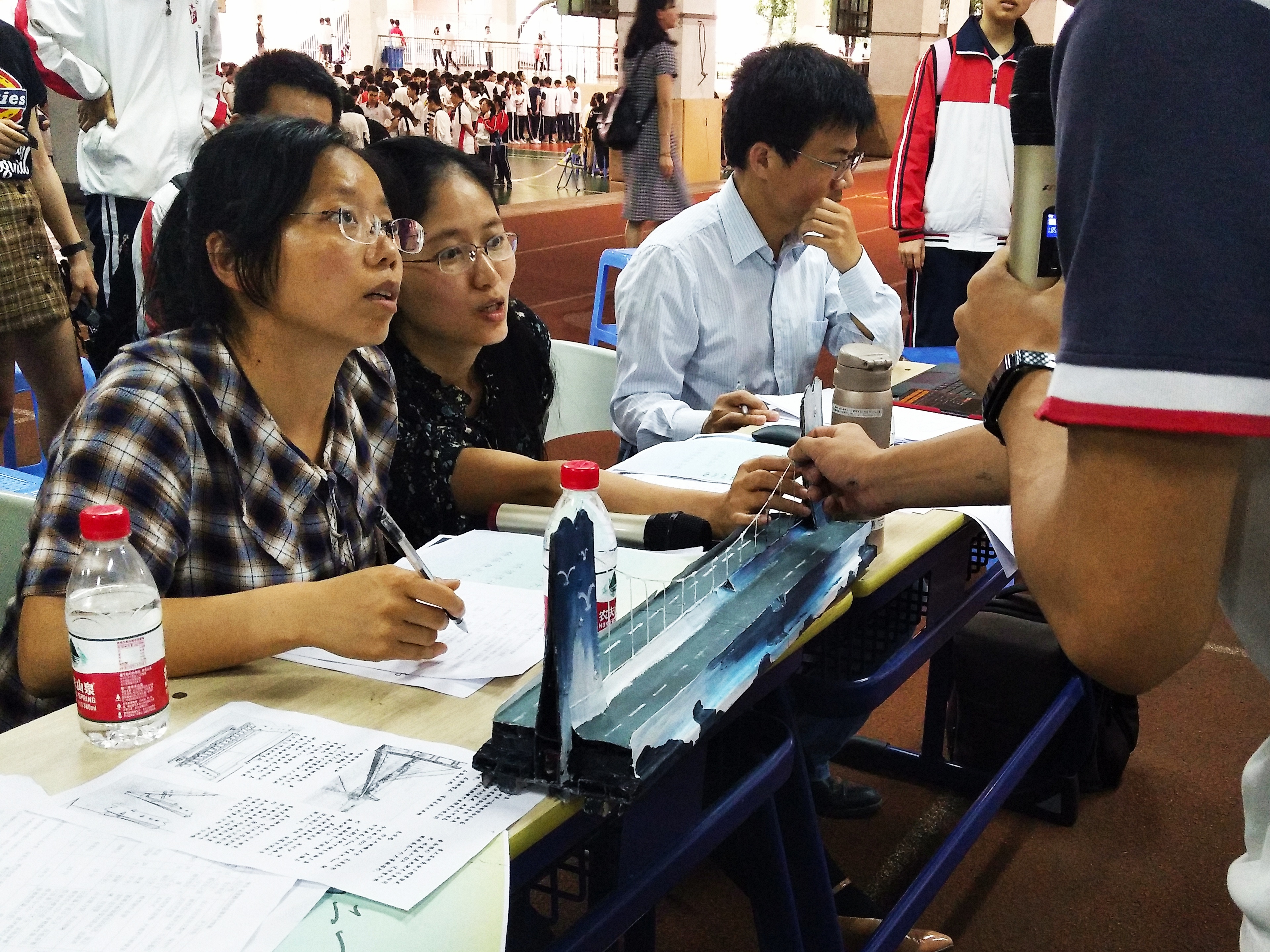 5月17日下午,比賽在師大附中室內體育館內進行,我系高璋生、陳世九、曾惠珍、王桂茵等四位教師受邀擔任比賽評委。共有11組同學相繼上臺,向評委老師和觀眾們展示自己的參賽作品,介紹模型與的設計思路和制作過程,并進行了模型加載測試。隨后評委老師對參賽作品進行提問點評、打分并提出可行性建議。比賽現(xiàn)場氣氛活躍,尤其是模型加載環(huán)節(jié)更是將比賽氣氛推向高潮,贏得了同學們的陣陣掌聲。