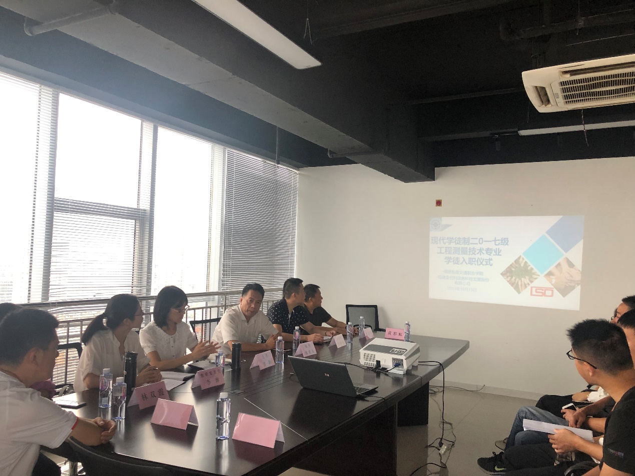 2019年10月13日上午,現(xiàn)代學(xué)徒制工程測量技術(shù)專業(yè)2017級入職儀式在福建金創(chuàng)利信息科技發(fā)展股份有限公司隆重舉行。福建省制圖院林院長,福建省地質(zhì)勘察院林工,福建省測繪院官工,福建省閩北地質(zhì)大隊林工,道路工程系黃穎副主任,工程測量技術(shù)專業(yè)教研室全體教師出席了此次活動。入職儀式由學(xué)工程測量技術(shù)專業(yè)教研室主任李琳老師主持。