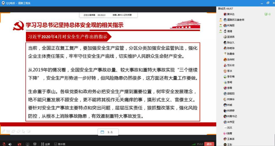 專題學(xué)習(xí)會議15:00開始,由林霞書記主持,黃華達(dá)老師主講,全體教職工通過QQ直播的方式參與。黃華達(dá)老師首先介紹了國家安全的內(nèi)容,危害國家安全的行為,如何維護(hù)國家安全等相關(guān)知識。其次,介紹了網(wǎng)絡(luò)安全法的制定、特點和公民的義務(wù)與權(quán)力。最后傳達(dá)了近期習(xí)總書記論堅持總體國家安全觀的相關(guān)知識。