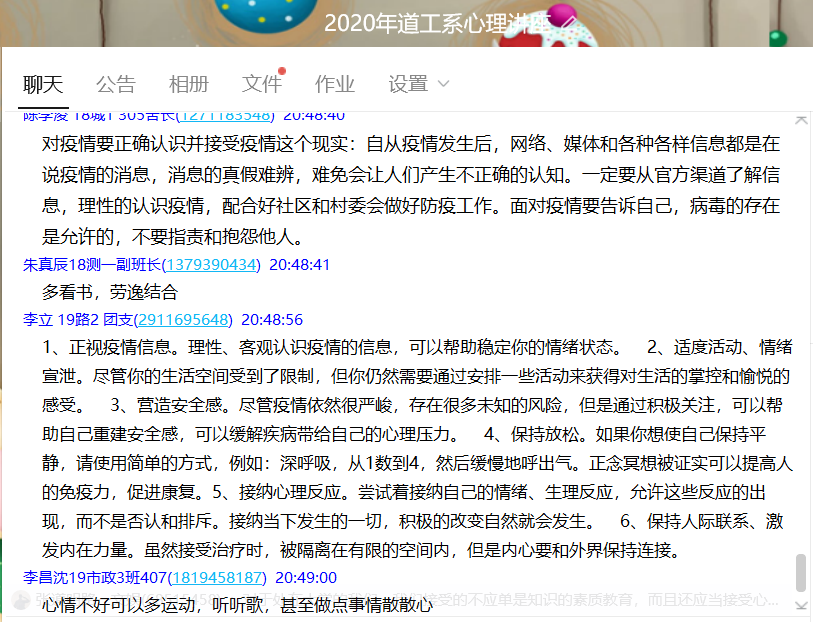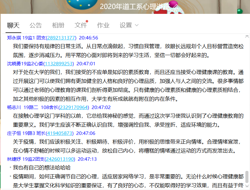 丘文福老師以“疫情影響下的大學(xué)生的心理應(yīng)對(duì)”為主線,簡單介紹了目前新冠肺炎疫情的現(xiàn)狀,然后結(jié)合疫情居家、線上講學(xué)等生活體驗(yàn),分析了疫情可能給大學(xué)生心理帶來的負(fù)面影響,從科學(xué)的角度教大家如何正確理解疫情期間的心理,如何更好地識(shí)別、理解、接納、排解及幫助他人排解不良情緒。丘老師不僅從不同方面向我們展現(xiàn)如何更好地提升居家學(xué)習(xí)質(zhì)量,也從實(shí)際出發(fā)為同學(xué)們營造良好的親自關(guān)系提供了有效建議。最后,在講座的線上互動(dòng)環(huán)節(jié)中,丘老師根據(jù)同學(xué)們目前的具體狀態(tài)和困難,結(jié)合理論及實(shí)踐經(jīng)驗(yàn)做了全面細(xì)致的分析,有針對(duì)性地給予了指導(dǎo)和建議。