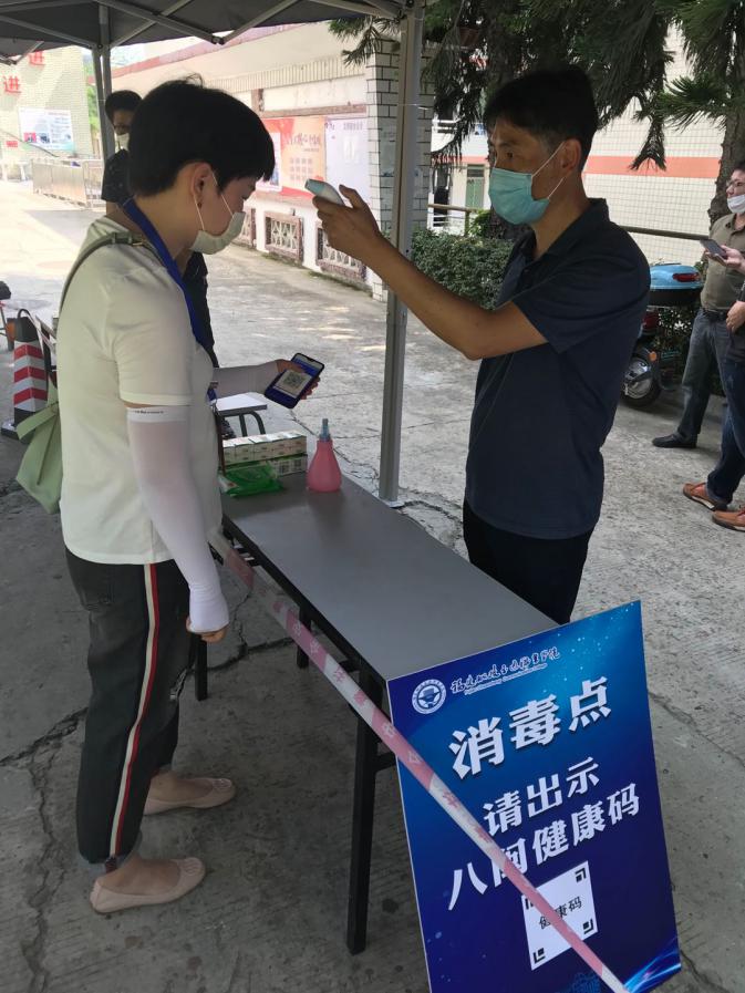 演練以情景模擬和現(xiàn)場演練相結(jié)合的方式進(jìn)行,演練內(nèi)容包括體溫檢測、身份證(學(xué)生證)核驗(yàn)、“八閩健康碼”核驗(yàn)、消毒、發(fā)放防疫物品、學(xué)生宿舍入住登記等情景。在演練現(xiàn)場,由輔導(dǎo)員扮演的學(xué)生到達(dá)指定入校點(diǎn),在學(xué)校工作人員引導(dǎo)下有序間隔排隊(duì)進(jìn)行查驗(yàn)。在入校報(bào)到演練環(huán)節(jié),分別針對(duì)體溫正常學(xué)生、發(fā)熱學(xué)生及未報(bào)備擅自返校學(xué)生等進(jìn)行了不同場景的現(xiàn)場演練。