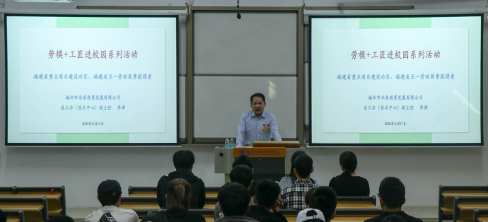 為大力弘揚(yáng)勞動(dòng)光榮、技能寶貴、營(yíng)造“勞模+工匠”精神育人的校園新文化,培養(yǎng)師生高度的文化自信和文化自覺(jué),結(jié)合我院實(shí)際,土木工程學(xué)院于2020年11月11日邀請(qǐng)了福州市水務(wù)投資發(fā)展有限公司總工辦副主任李濤來(lái)校開(kāi)設(shè)講座活動(dòng)。土木工程學(xué)院市政教研室全體教師、市政工程技術(shù)專(zhuān)業(yè)學(xué)生共150余人聆聽(tīng)了報(bào)告,報(bào)告會(huì)由市政教研室主任魏天云主持。