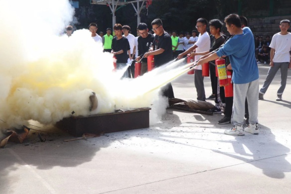 在高蓋山籃球場(chǎng),首先由學(xué)院自律會(huì)負(fù)責(zé)人向同學(xué)講解宿舍消防安全的重要性及用電相關(guān)注意事項(xiàng);接著由校園110聯(lián)動(dòng)隊(duì)隊(duì)員為同學(xué)們講解并展示消防水帶和滅火器的正確使用方法;隨后各班代表出場(chǎng)進(jìn)行滅火練習(xí);最后師生代表共同在橫幅上簽字,鄭重承諾嚴(yán)格遵守校園消防安全規(guī)則。