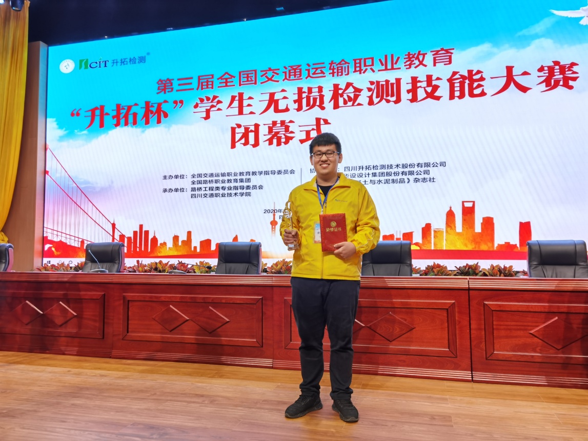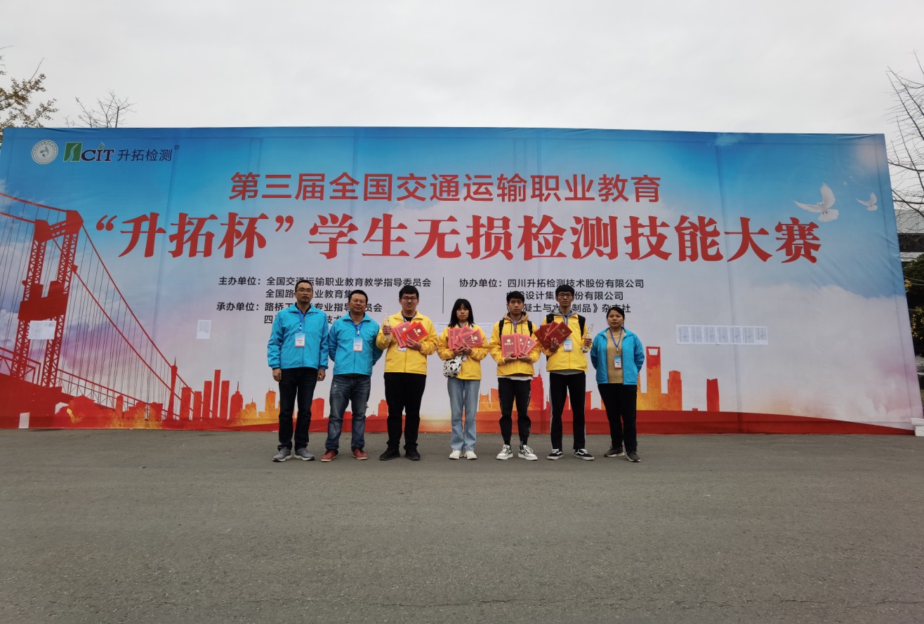 2020年11月17日至11月21日,第三屆“升拓杯”學(xué)生無(wú)損檢測(cè)技能大賽在四川交通職業(yè)技術(shù)學(xué)院舉辦,共有來(lái)自全國(guó)26個(gè)省、市、自治區(qū)79所院校的160支代表隊(duì)參加。本次競(jìng)賽包括理論競(jìng)賽和實(shí)操競(jìng)賽兩部分,其中實(shí)操競(jìng)賽有混凝土結(jié)構(gòu)厚度及缺陷測(cè)定、錨桿長(zhǎng)度測(cè)定、鋼筋保護(hù)層厚度及鋼筋間距測(cè)定等項(xiàng)目。我院學(xué)子踴躍爭(zhēng)先、配合默契,表現(xiàn)出了良好的精神風(fēng)貌,取得優(yōu)異成績(jī)。兩支參賽隊(duì)取得團(tuán)體二等獎(jiǎng)兩項(xiàng);錨桿長(zhǎng)度測(cè)定單項(xiàng)一等獎(jiǎng)一項(xiàng)(排名第一),二等獎(jiǎng)一項(xiàng);混凝土結(jié)構(gòu)厚度及缺陷測(cè)定一等獎(jiǎng)一項(xiàng),三等獎(jiǎng)一項(xiàng);理論單項(xiàng)二等獎(jiǎng)三項(xiàng)。
