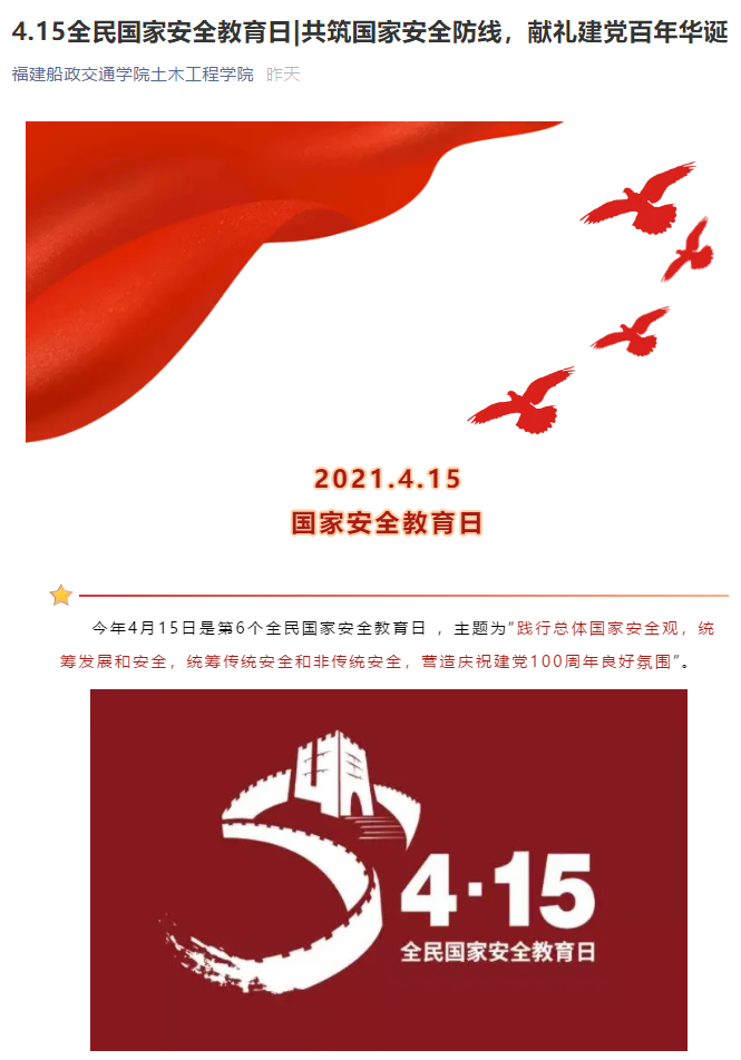 4月15日是全民國家安全教育日,土木工程學(xué)院黨總支以“踐行總體國家安全觀,統(tǒng)籌發(fā)展和安全,統(tǒng)籌傳統(tǒng)安全和非傳統(tǒng)安全,營造慶祝建黨100周年良好氛圍”為主題,通過“五個一”活動扎實開展全民國家安全教育日活動。