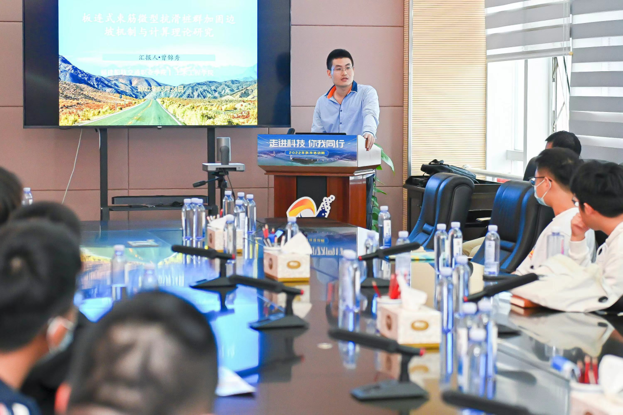 活動現(xiàn)場,“北斗變形監(jiān)測虛擬仿真培訓平臺”和“交通基礎設施BIM+GIS信息化管養(yǎng)平臺”兩大科技創(chuàng)新成果項目組成員分別向與會嘉賓介紹了平臺的功能、創(chuàng)新性等,并進行更深層次的探討。期間我院曾錦秀博士應邀做題為“板連式束筋微型抗滑樁群加固邊坡機制與計算理論”的高新技術科普專題講座。