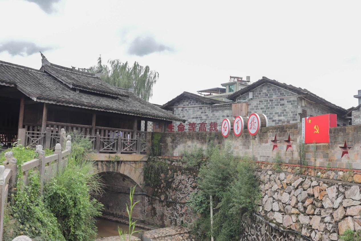 進(jìn)入中復(fù)村向前行走不遠(yuǎn)處,有一座古樸的廊橋——紅軍橋,在廊橋的左上方,木板上用毛筆寫有“救國不分男女老幼”八個大字,白色的字體是那樣的鮮紅而火熱。紅軍橋的柱子上有一條“生命等高線”。歲月的斑駁早已爬滿橋柱,那條線卻依然清晰,這就是當(dāng)時的紅軍征兵處。線高大約1.5米,是一把上了刺刀的步槍的高度。“人比槍高當(dāng)紅軍”——當(dāng)?shù)厝硕贾?,這就是當(dāng)年紅軍征兵處的等高線。紅軍橋上的那條征兵等高線前,鄉(xiāng)村振興實踐團(tuán)成員們無數(shù)次駐足,重溫著過往歲月。