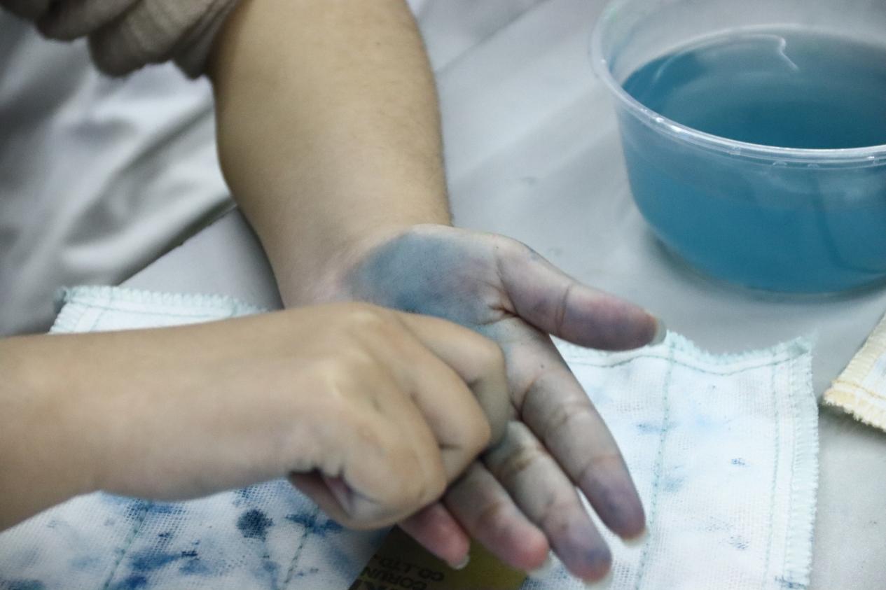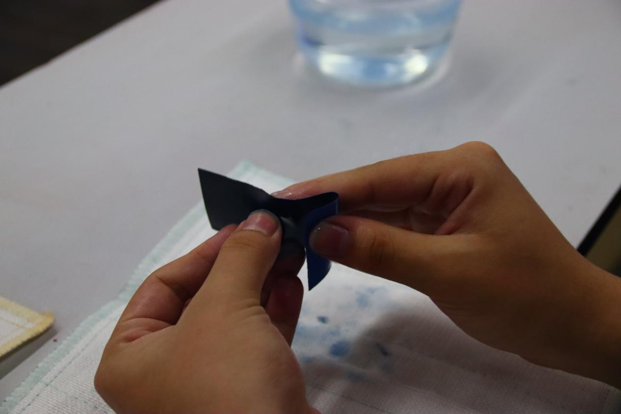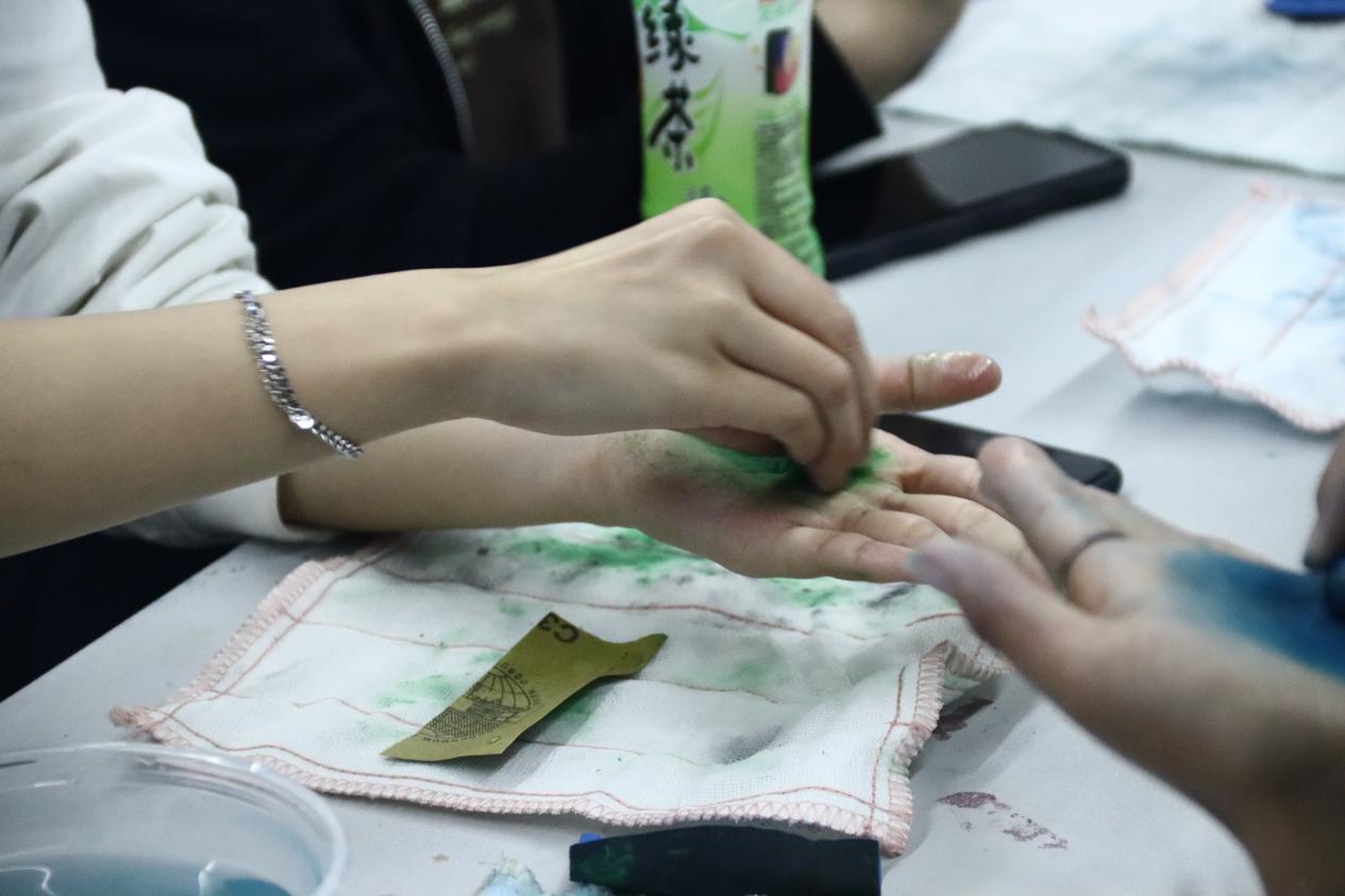 通過講解,同學們了解到福州漆器始于南宋,福州脫胎漆器特點:質(zhì)地輕巧堅牢,造型古樸大方,裝飾豐富多彩,不褪色、堅固、耐溫、耐酸堿腐蝕。講解過后,同學們親自上手體驗了一把“脫漆工藝”利用砂紙進行打磨,露出柱子漆藝下原本的光澤,但不能磨得太過用力,否則會將漆損壞,露出漆中的木球。