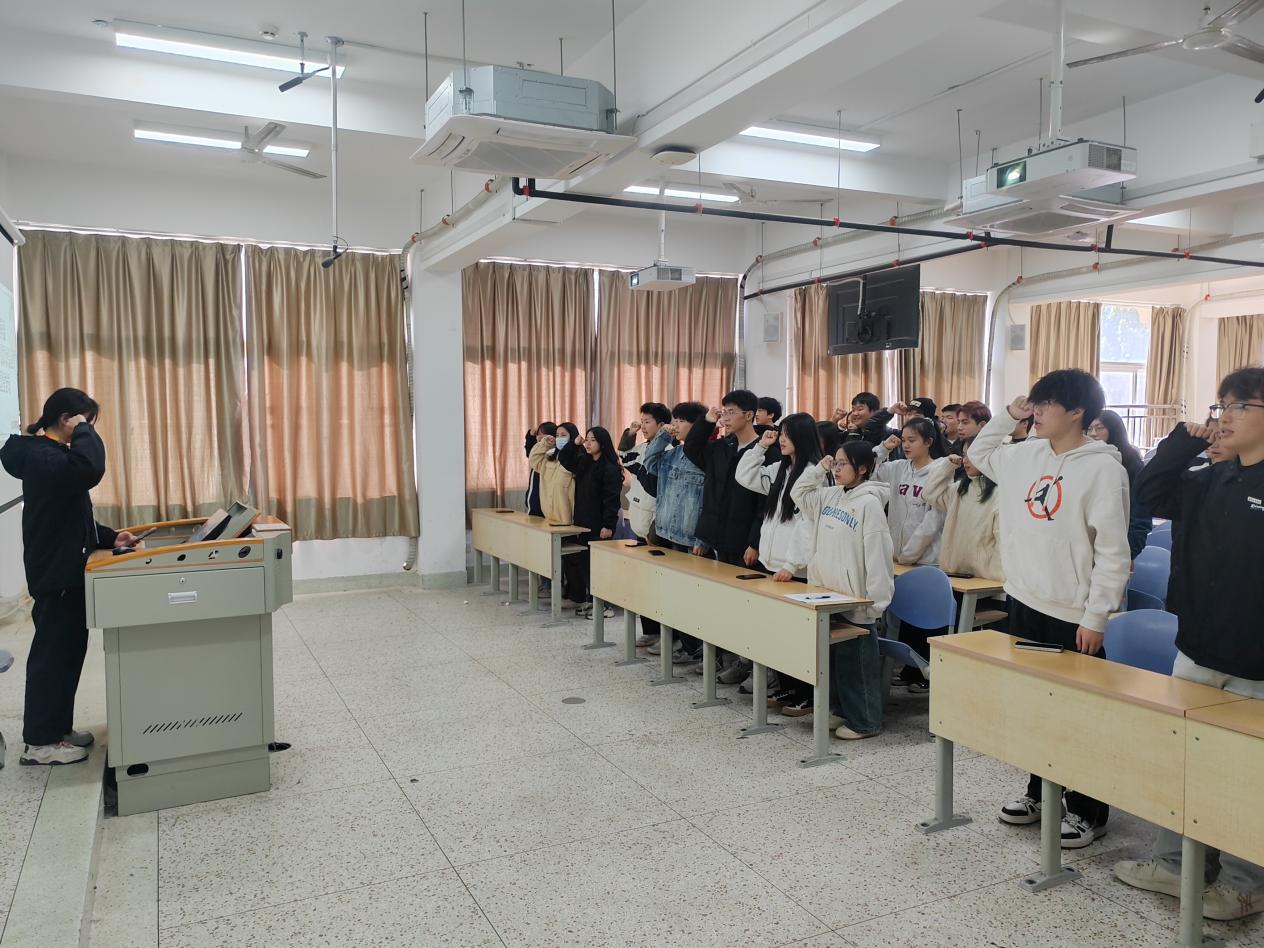 活動開始,胡啟航老師闡述了誠信考試的重要性,強調(diào)了“誠信為人之本”的重大意義,鼓勵班委們主動承擔起加強學風建設的責任,呼吁同學們認真復習、積極備考。隨后,參加人員全體起立,舉起右手一同宣誓:“我莊嚴宣誓,自覺遵守考試紀律,公平參與考試競爭,珍惜名譽,誠信做人,誠實應考,以實力爭取優(yōu)異成績,以誠信展現(xiàn)良好學風,誠信考試,絕不作弊,弘揚誠信考風,爭做誠信考生 。”