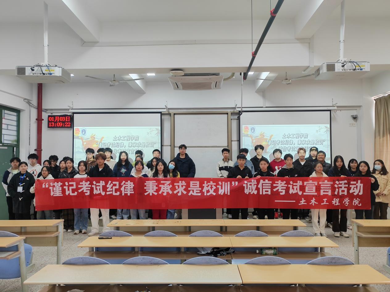 “樹道德之風,立誠信之本,當誠信考生,做文明學生”。為端正考風,嚴肅考紀,提高學生的誠信意識,樹立正確的價值觀,1月3日,土木工程學院在創(chuàng)新樓302舉辦“謹記考試紀律,秉承求是校訓”誠信考試宣言活動。