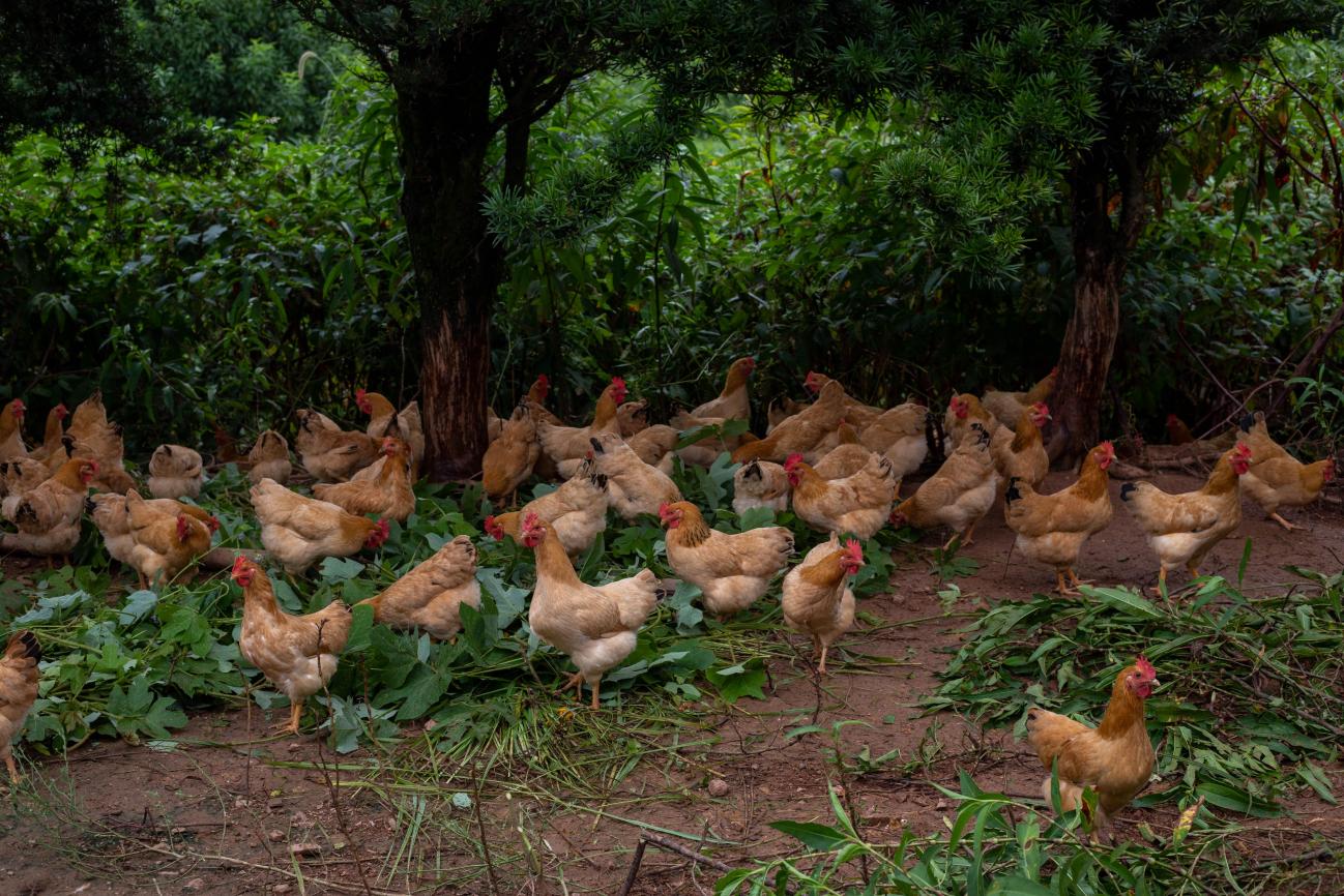 據(jù)介紹,這里曾經(jīng)是寸草不生、水土流失嚴(yán)重的稀土礦廢棄場。2006年,雞場創(chuàng)辦人藍(lán)曉紅承包村里的500畝荒山,開始了“種樹+養(yǎng)雞”的綠色生態(tài)雞場建設(shè)事業(yè)。此后的日子在“種樹—養(yǎng)雞—賣雞苗—種樹”中循環(huán)往復(fù),藍(lán)曉紅在銷售雞苗過程中,每到一地都要帶回不少樹苗。多年來,她種下桂花、油茶、毛竹、紅豆杉等苗木1萬余株,終于將這里變成了綠樹成蔭、雞鳥爭鳴的美麗綠洲。水土生態(tài)的改善也為河田雞的養(yǎng)殖提供了天然場所。雞奔走綠林山間,食百草飛蟲,飲山泉溪水,成為了營養(yǎng)豐富、口感緊實(shí)的世界名雞。而雞的雞糞又為林子提供了養(yǎng)料,儼然形成了一種共生共存的可持續(xù)發(fā)展模式。