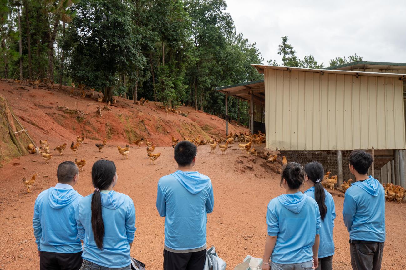 圖5:實(shí)踐團(tuán)師生在蘭秀河田雞場近距離觀摩生態(tài)雞舍