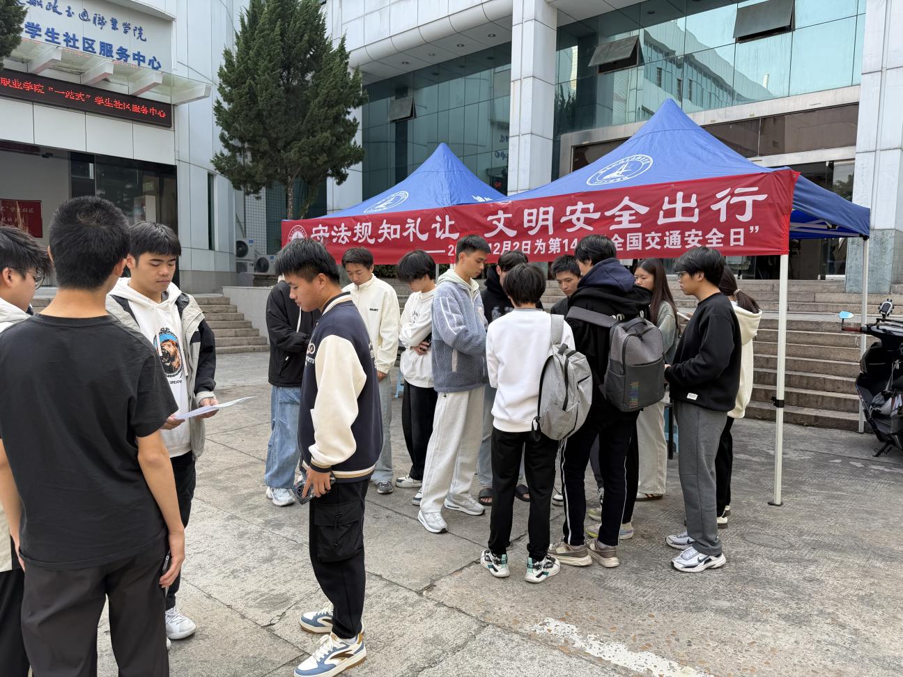 為深入貫徹落實(shí)交通安全相關(guān)法律法規(guī),切實(shí)增強(qiáng)學(xué)生的交通安全意識(shí)、提升文明出行素養(yǎng)。2025年12月2日,在第14個(gè)“全國(guó)交通安全日”來(lái)臨之際,土木工程學(xué)院于福航園“一站式”學(xué)生社區(qū)服務(wù)中心開(kāi)展以“守法規(guī)知禮讓,文明安全出行”為主題的交通安全宣傳教育活動(dòng)。