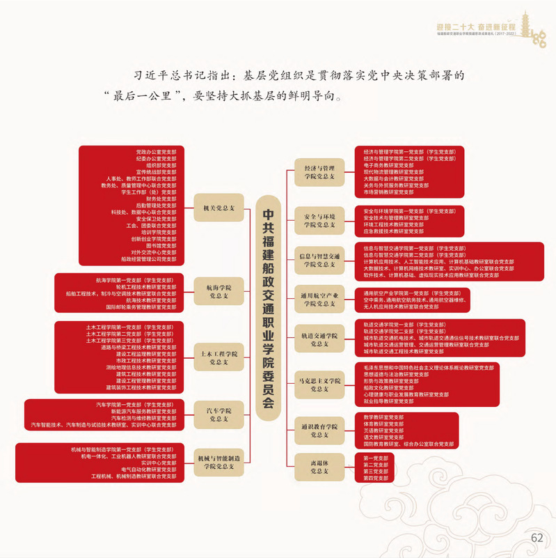 十九大以來,福建船政交通職業(yè)學院堅持以習近平新時代中國特色社會主義思想為指導,堅持社會主義辦學方向,深入貫徹黨的十九大和十九屆歷次全會精神,堅守“為黨育人、為國育才”的初心和使命,慎終如始推進學校黨的政治建設、思想建設、組織建設、作風建設、紀律建設、制度建設,黨的組織體系和學校治理體系相得益彰,黨建引領推動創(chuàng)新船政、質量船政、文化船政協(xié)奏齊鳴,政治生態(tài)、學術生態(tài)、文化生態(tài)持續(xù)向好,辦學效率、辦學效能、辦學效益顯著提升!