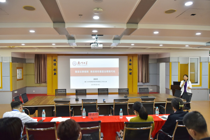 會(huì)議邀請了廈門大學(xué)黨建辦主任、組織部副部長廖志丹做了《落實(shí)議事規(guī)則 推進(jìn)高?;鶎又卫憩F(xiàn)代化》專題輔導(dǎo)報(bào)告會(huì)。廖主任結(jié)合專項(xiàng)檢查、現(xiàn)場推進(jìn)會(huì)以及在廈門大學(xué)開展的議事規(guī)則調(diào)研等所發(fā)現(xiàn)的問題,從解讀《中國共產(chǎn)黨普通高等學(xué)?;鶎咏M織工作條例》入手,對如何進(jìn)一步規(guī)范二級學(xué)院領(lǐng)導(dǎo)班子權(quán)力運(yùn)行和決策機(jī)制做了詳細(xì)的專題輔導(dǎo)。