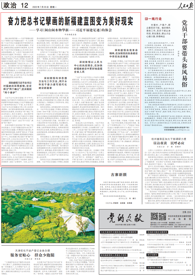 今天,人民日?qǐng)?bào)刊發(fā)文章《奮力把總書(shū)記擘畫(huà)的新福建藍(lán)圖變?yōu)槊篮矛F(xiàn)實(shí)——學(xué)習(xí)<閩山閩水物華新——習(xí)近平福建足跡>的體會(huì)》,全文如下: