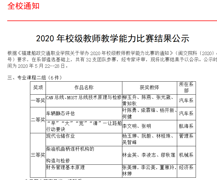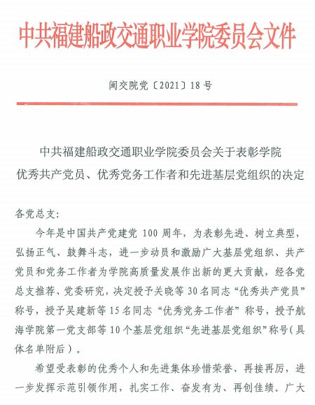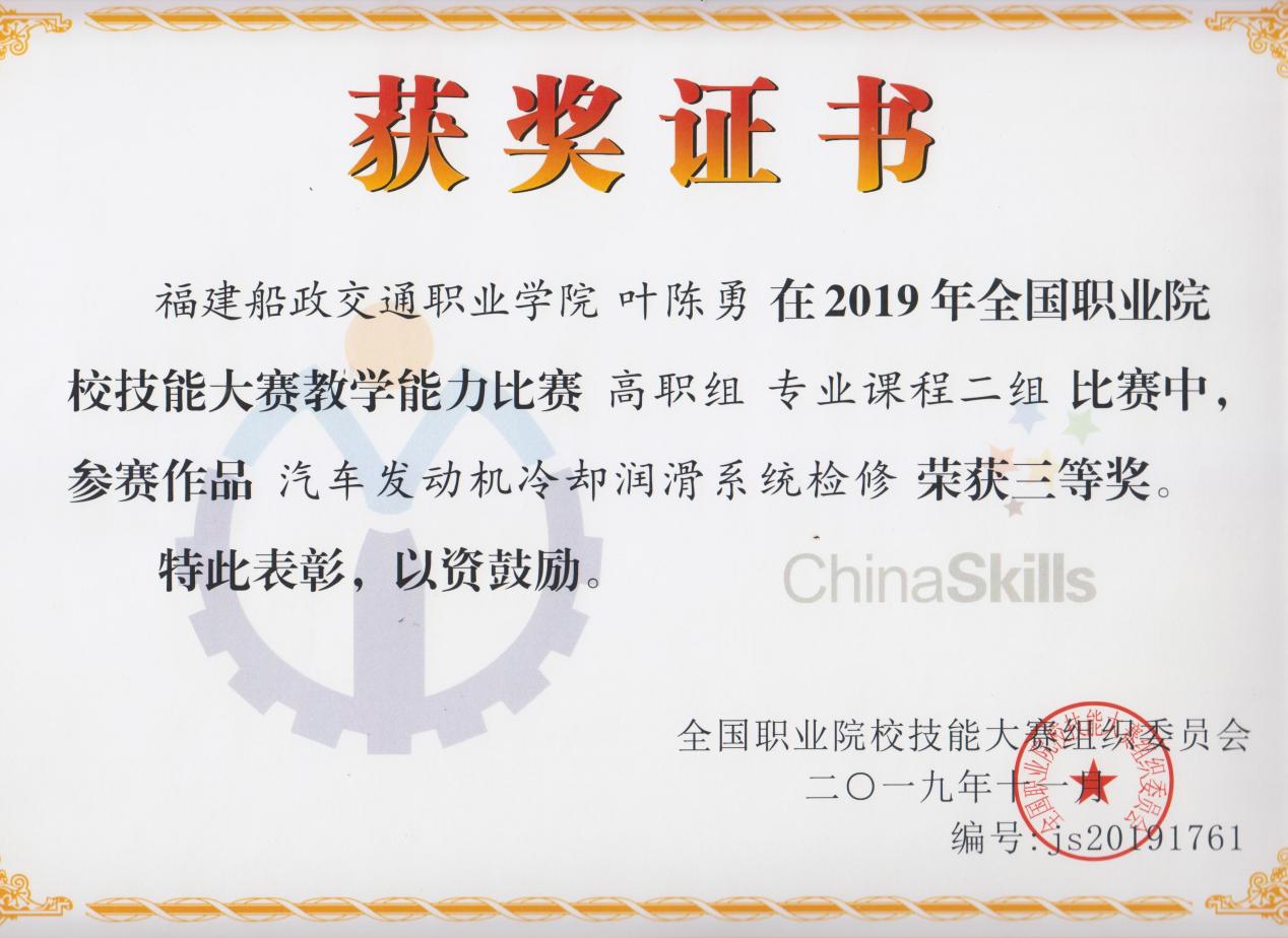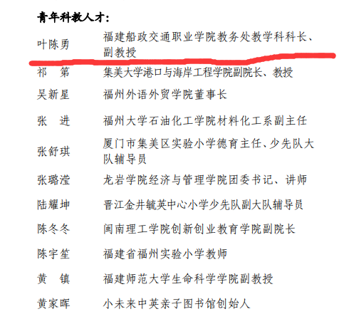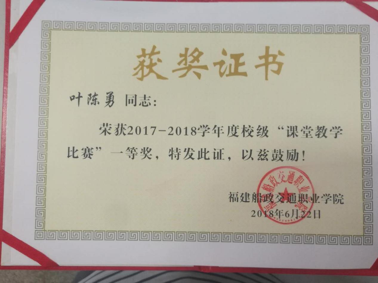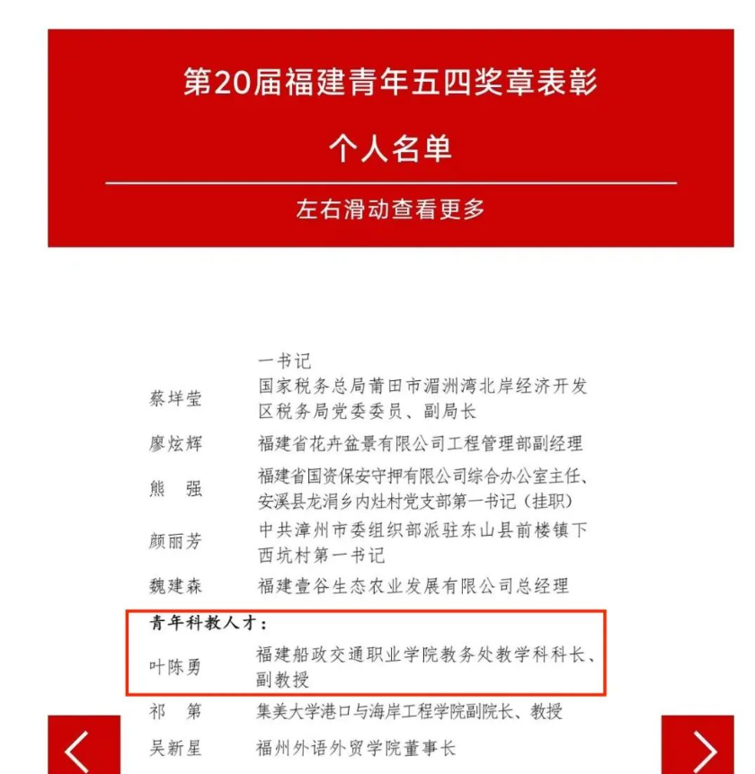 葉陳勇,福建船政交通職業(yè)學(xué)院教務(wù)處黨支部,男,1987年12月出生,2007年12月入黨,現(xiàn)任福建船政交通職業(yè)學(xué)院教務(wù)處教學(xué)科科長(副教授)。曾擔任汽車制造與裝配技術(shù)專業(yè)負責人,分赴加蓬共和國援教、中國教育會計學(xué)會高等職業(yè)院校分會掛職。曾獲加蓬共和國國家嘉獎狀,福建省第20屆五四青年獎,“最美逆行者”,全國職業(yè)院校教師教學(xué)能力比賽二等獎、三等獎,省教師教學(xué)能力比賽一等獎、二等獎,省技能大賽一等獎指導(dǎo)教師,建黨100周年之際校優(yōu)秀共產(chǎn)黨員,校首屆五四青年獎,校優(yōu)秀教師,校優(yōu)秀教育工作者,校級教學(xué)成果獎一二等獎等。