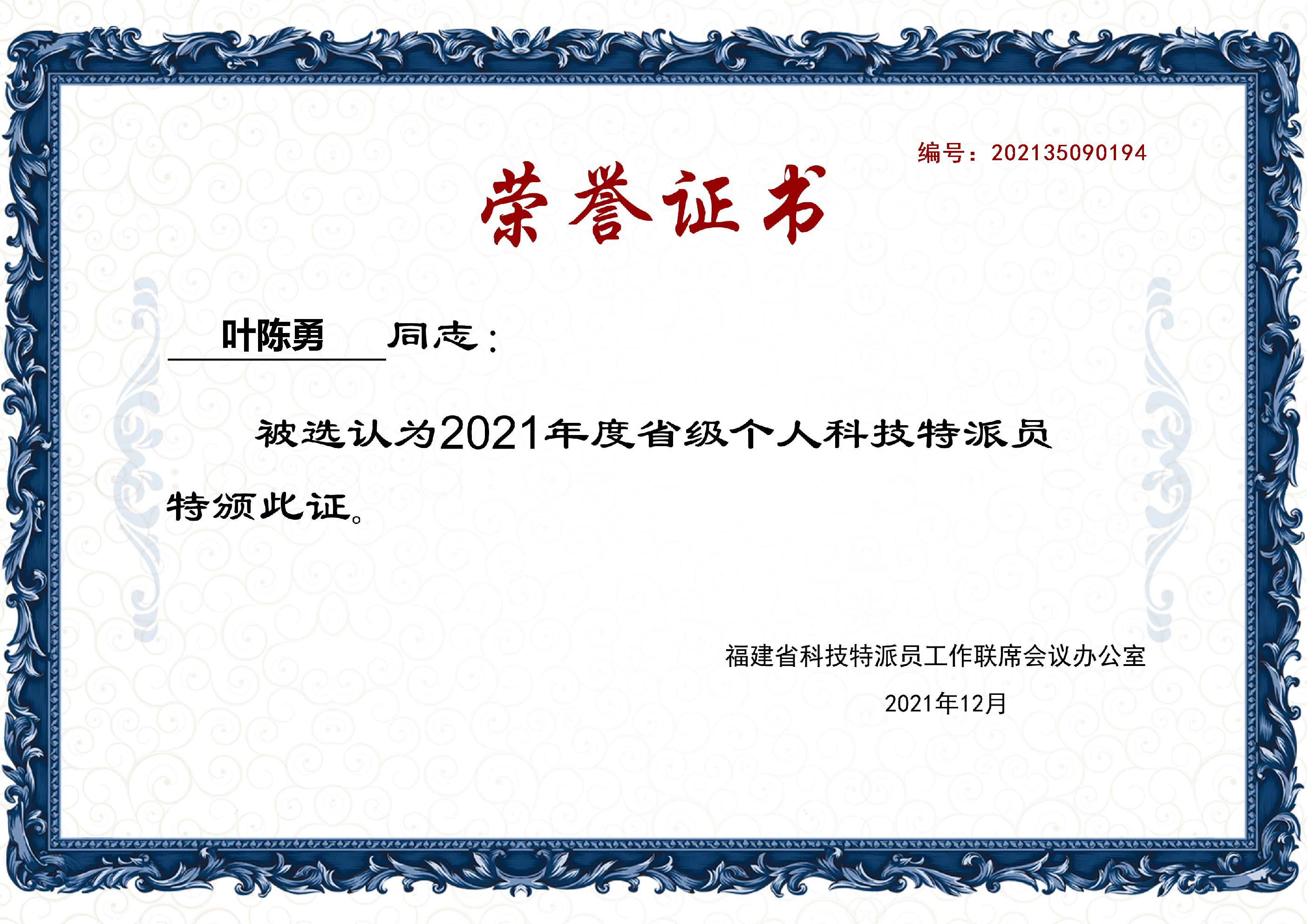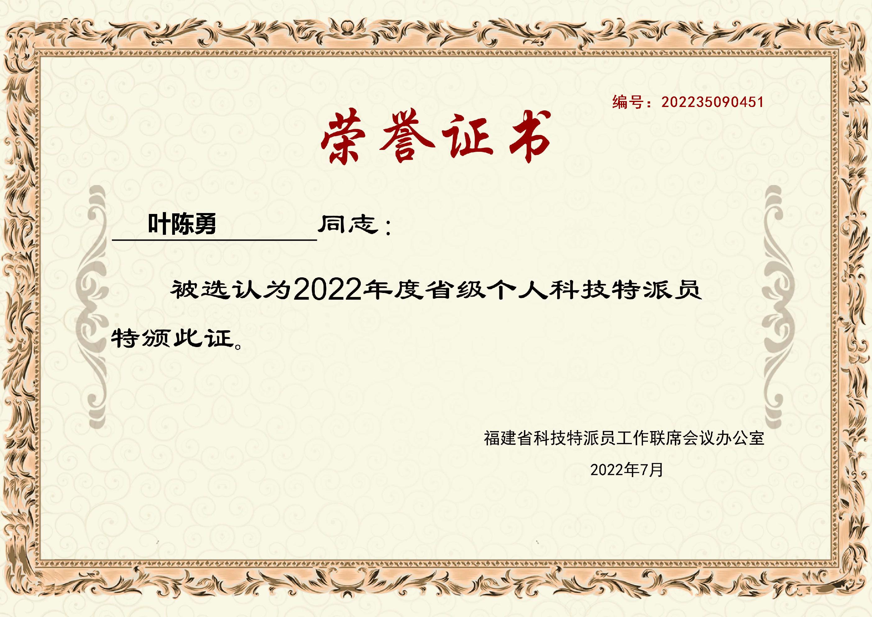 (五)2021年12月、2022年7月被福建省科技特派員工作聯(lián)席會議辦公室(福建省科學(xué)技術(shù)廳)選任為個人科技特派員、團隊科技特派員