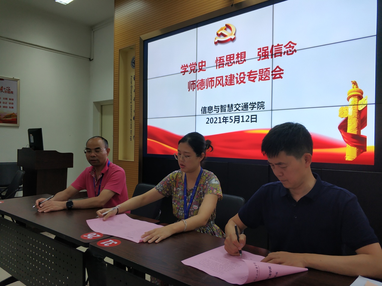 會上,學(xué)院總支書記許友孝帶領(lǐng)全體老師們認(rèn)真閱讀了《信息與智慧交通學(xué)院師德師風(fēng)承諾書》的各項內(nèi)容,強調(diào)堅決不觸碰師德紅線,做一個遵守紀(jì)律的老師。最后每位老師鄭重地在《信息與智慧交通學(xué)院師德師風(fēng)承諾書》上簽下了自己的名字。