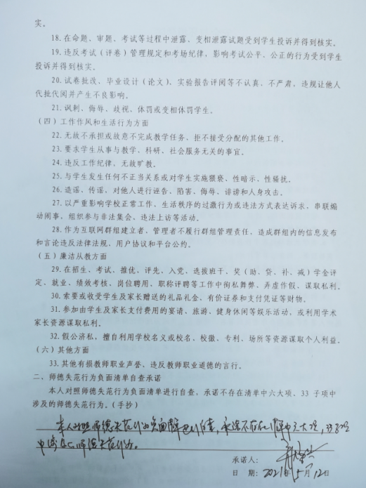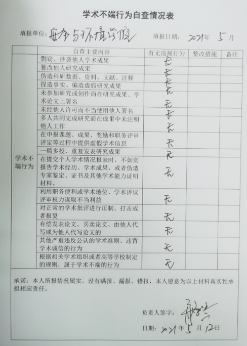 2、開展師風師德自查。逐個教師、逐個教研室進行徹底排查,落實每個教職工在思想政治紀律、學(xué)術(shù)道德、教育教學(xué)、工作作風、生活行為、廉潔從教及其他等諸方面是否存在師德失范行為。全體教職工公開表態(tài)承諾,并簽訂《安全與環(huán)境學(xué)院教師師德失范行為負面清單自查承諾書》和《學(xué)術(shù)不端行為自查情況表》。