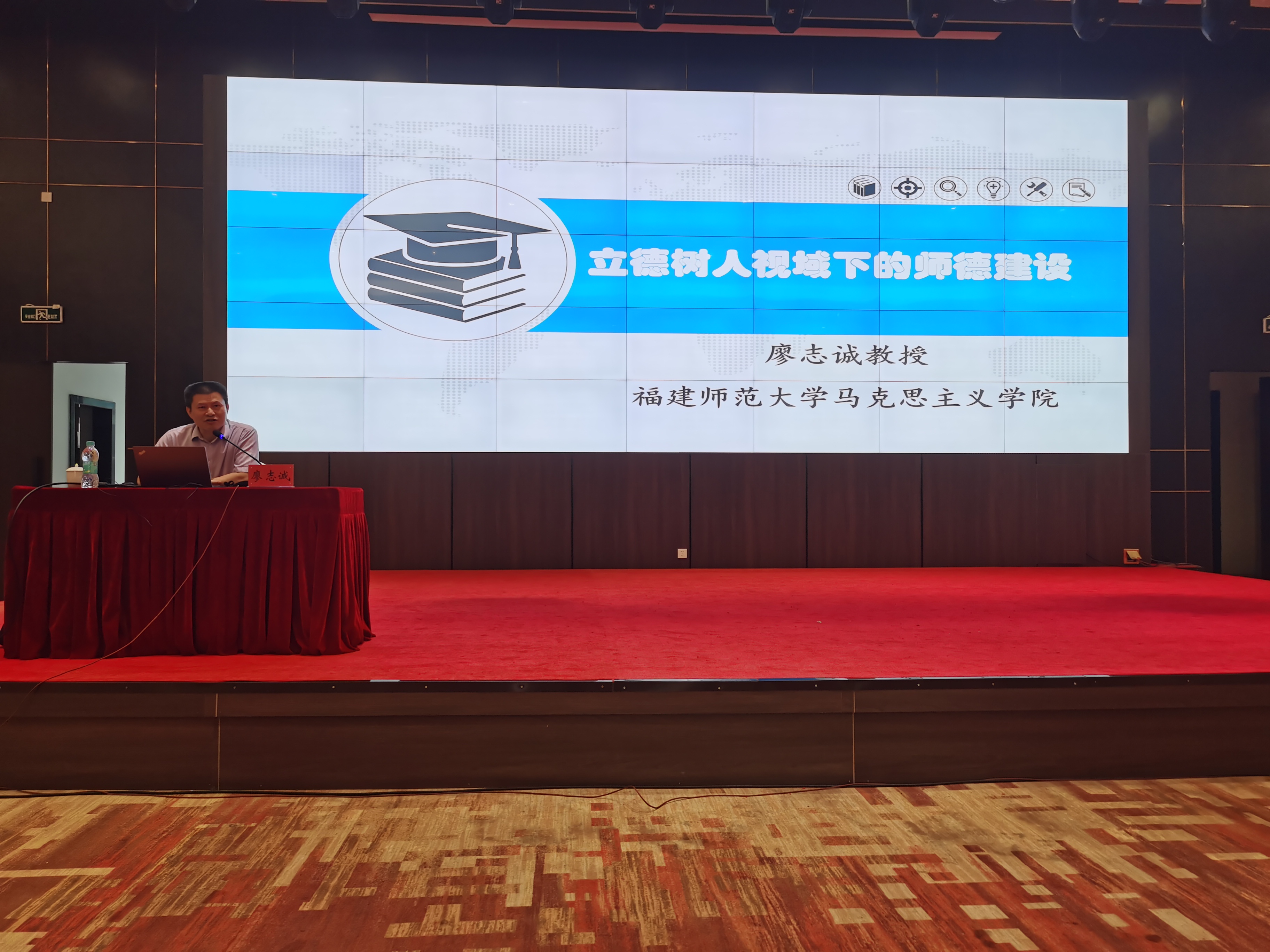福建師范大學馬克思主義學院教授、法學博士、碩導、思想政治教育專業(yè)碩士點學科帶頭人廖志誠以《立德樹人視域下的師德建設》為題,從師德建設的目標、任務、關鍵等入手全面分析了新時代立德樹人對師德的基本要求,通過理論分析、案例分享對如何在立德樹人視域下推進師德建設進行了解讀,為我校進一步推進師德師風建設具有積極意義。