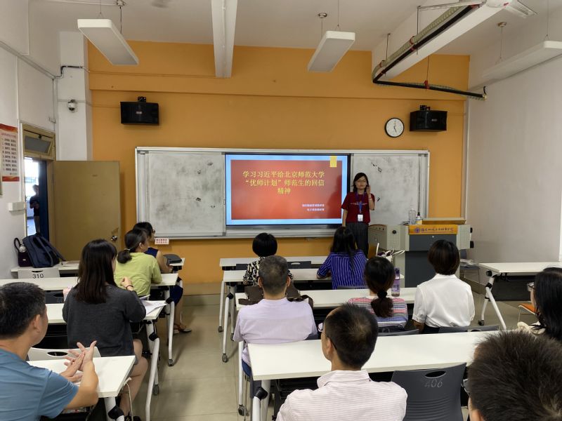 學(xué)習(xí)會(huì)上,俞素平書記帶領(lǐng)全體與會(huì)教師學(xué)習(xí)了習(xí)近平總書記給北京師范大學(xué)“優(yōu)師計(jì)劃”師范生重要回信內(nèi)容,并觀看了專題片《習(xí)近平的教師情》。